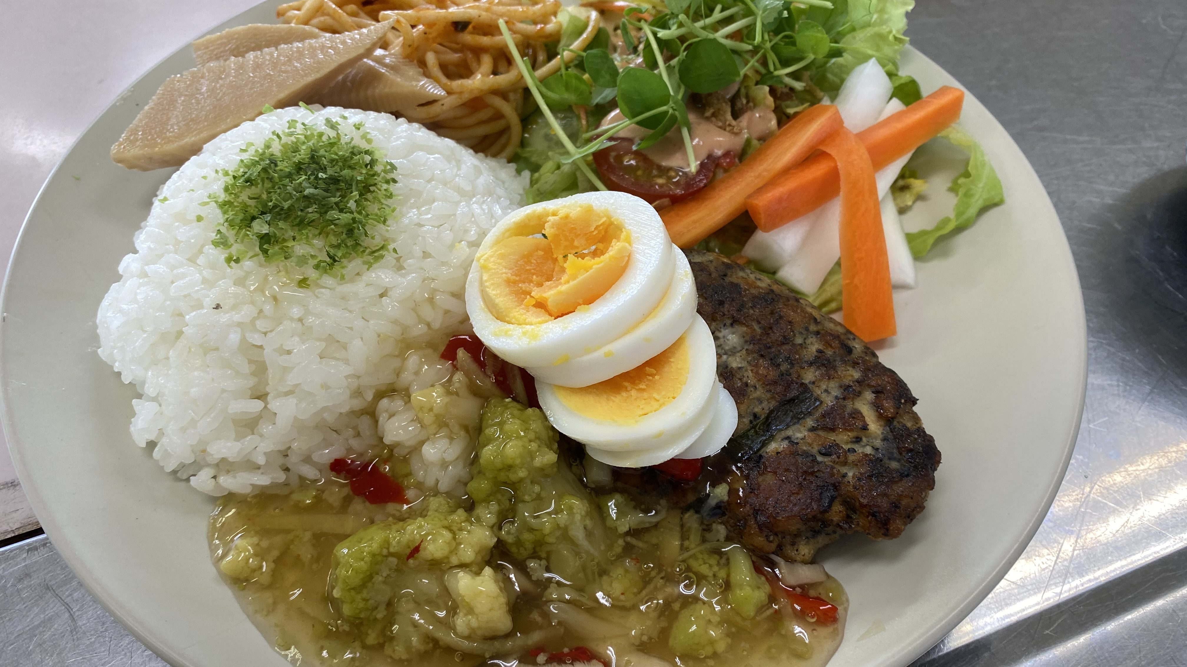 地元でカフェを経営している須合さんが切り盛りする「社員食堂」では、こんなワンプレートメニューを毎日のように食べることができる。