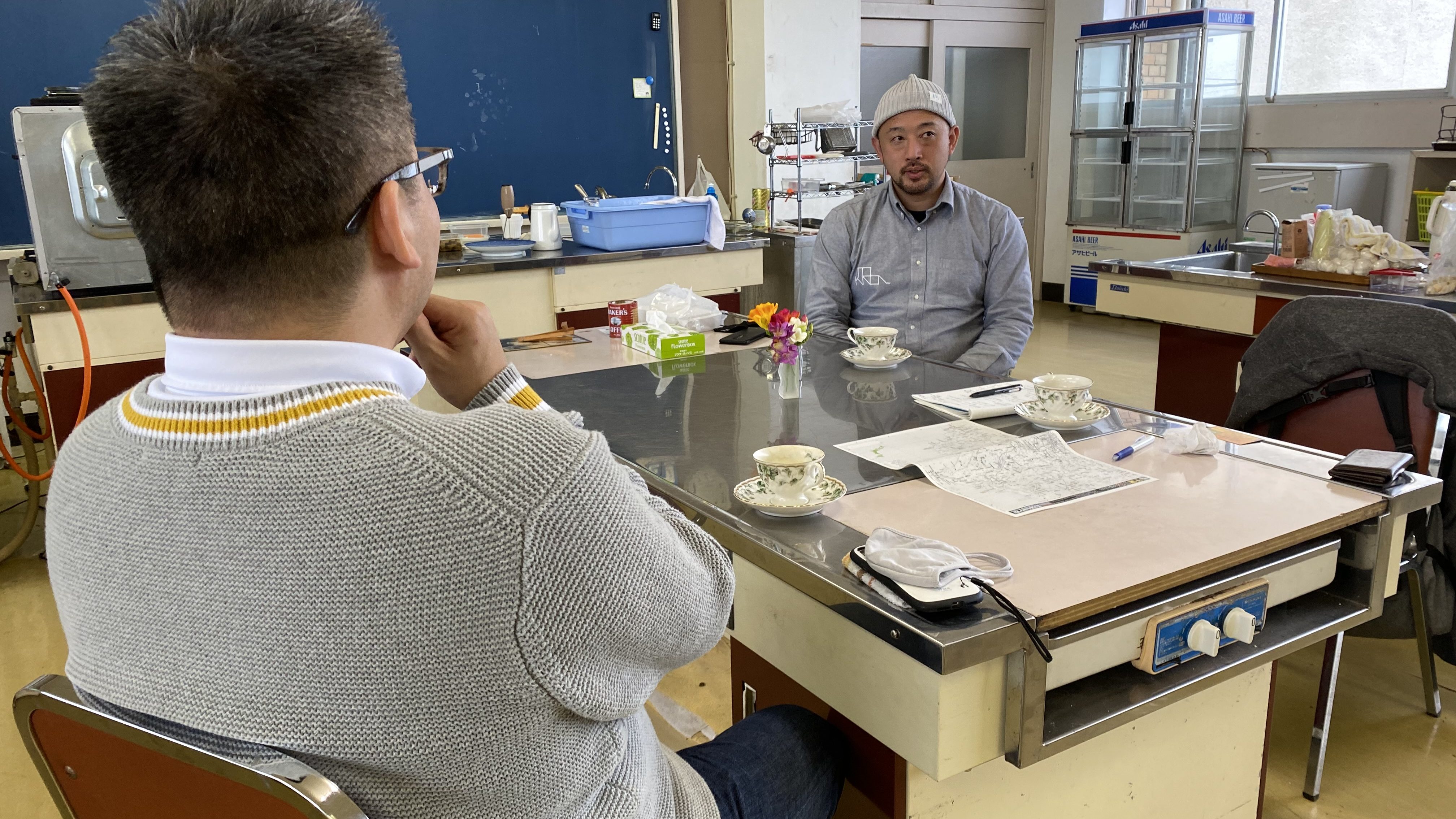 今回の訪問は、千葉市内で「千葉経済新聞」を編集している株式会社パクチーの福岡さんと一緒でした。福岡さんは、以前にもこのブログで紹介させて頂いた勝浦市の廃校利活用モデル「晴海学園」の事業主体の経営者でもある。柳堀さんも福岡さんも廃校の利活用に関する問題や課題、利点や活用事例、今後の方針などについて情報交換するために今回の視察が設定された。