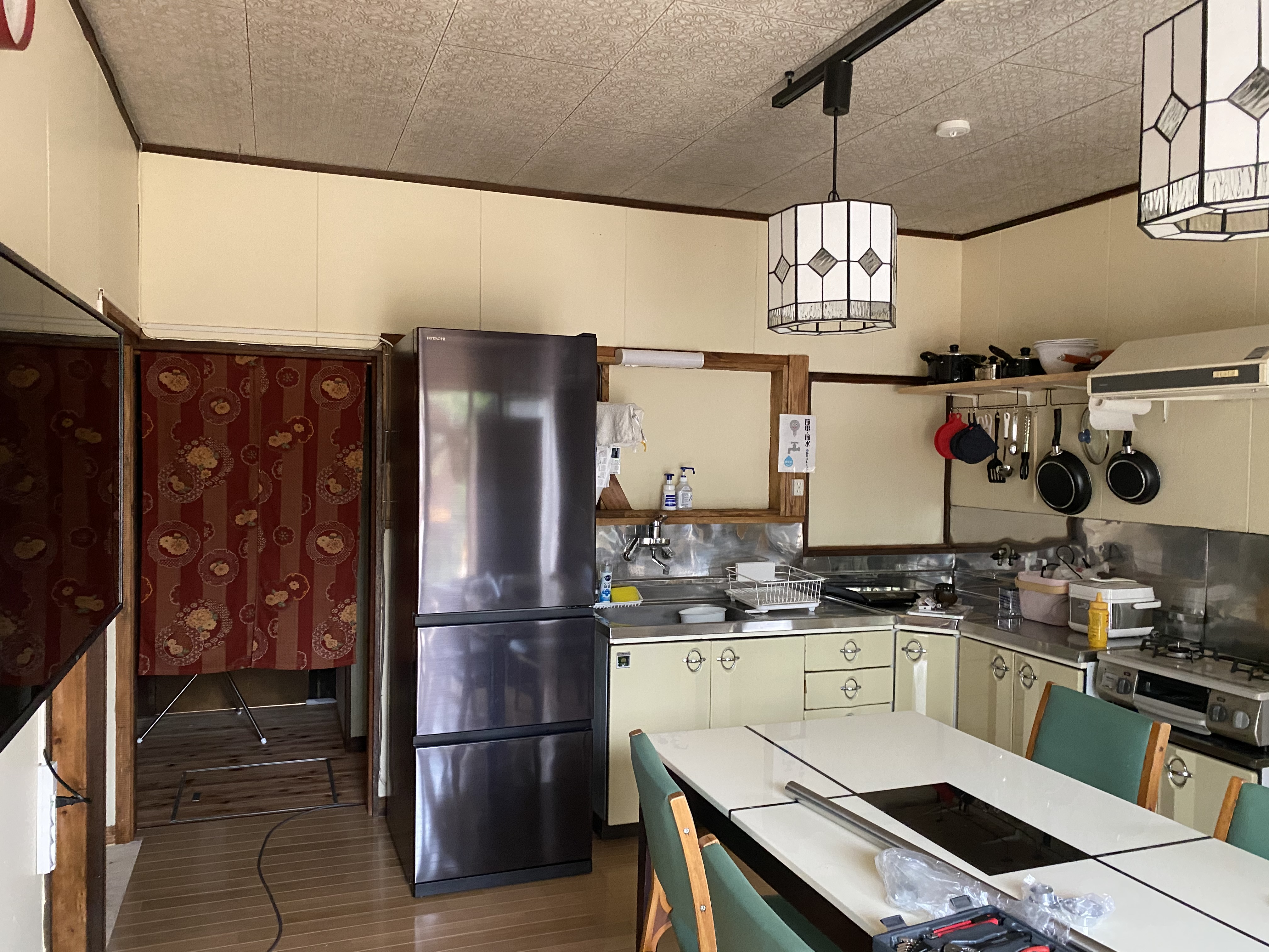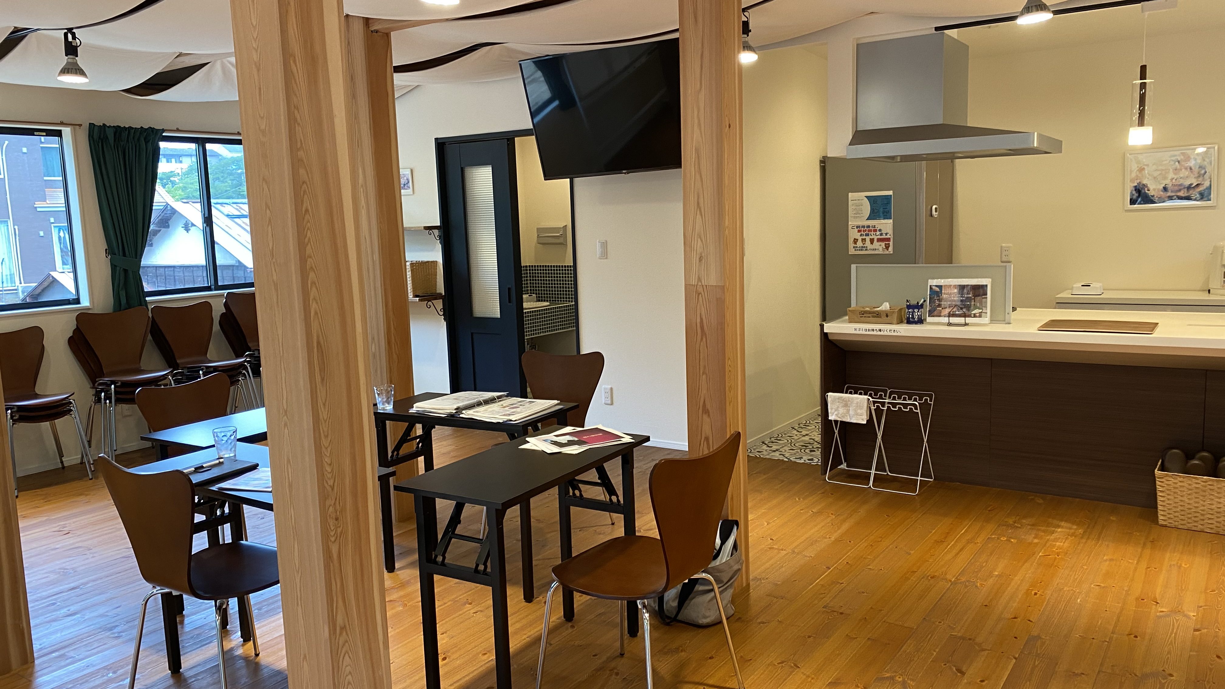 1階には24畳のシステムキッチン付きシェアスペース。会議やミーティング、趣味の時間などにも利用できるようホワイトボードや音響設備、55インチの4Kテレビなどを常備している「浪漫館」。冷蔵庫、オーブンレンジなどのキッチン周り一式も基本装備。入口の開錠はスマートロックで管理する。