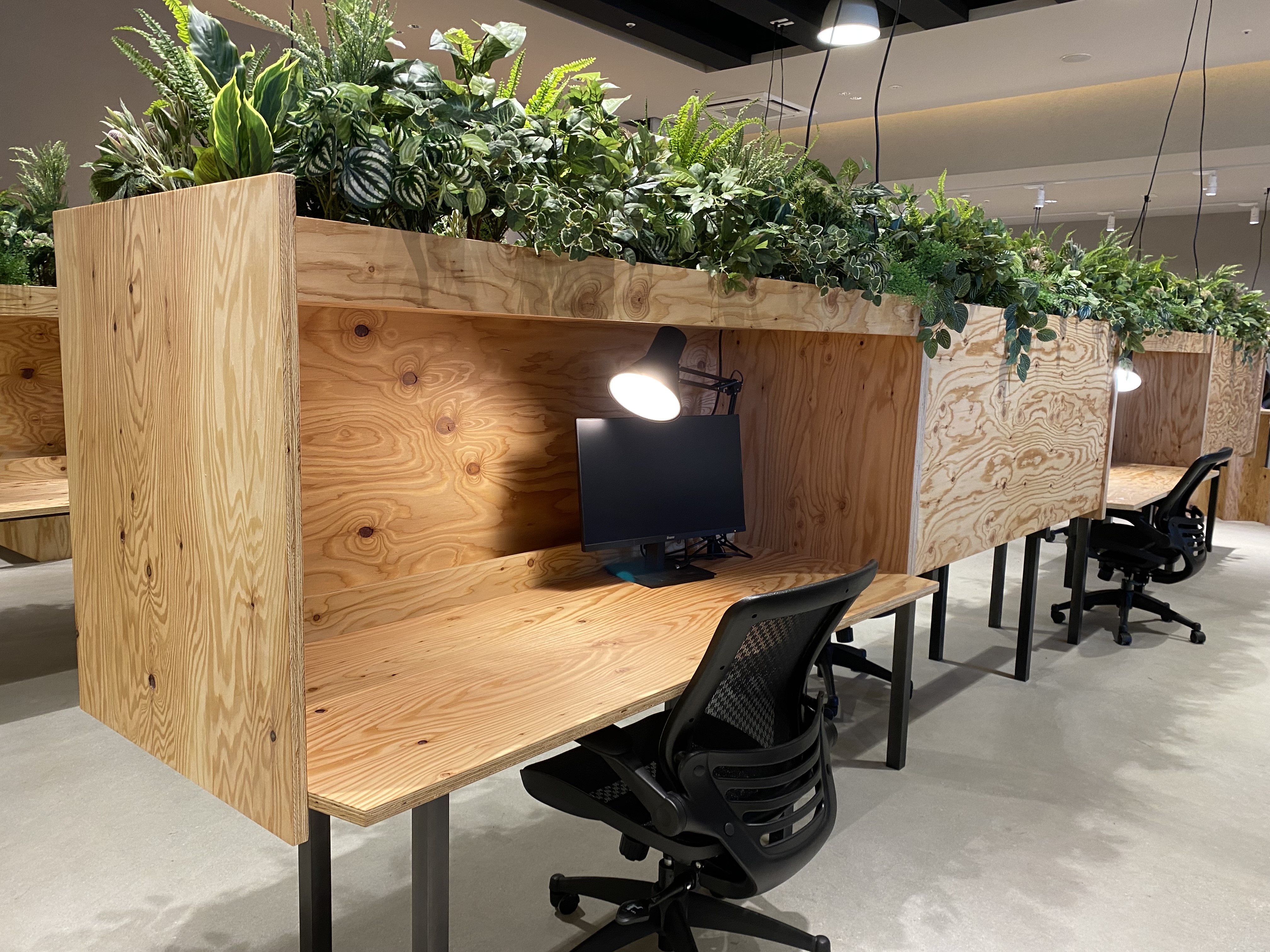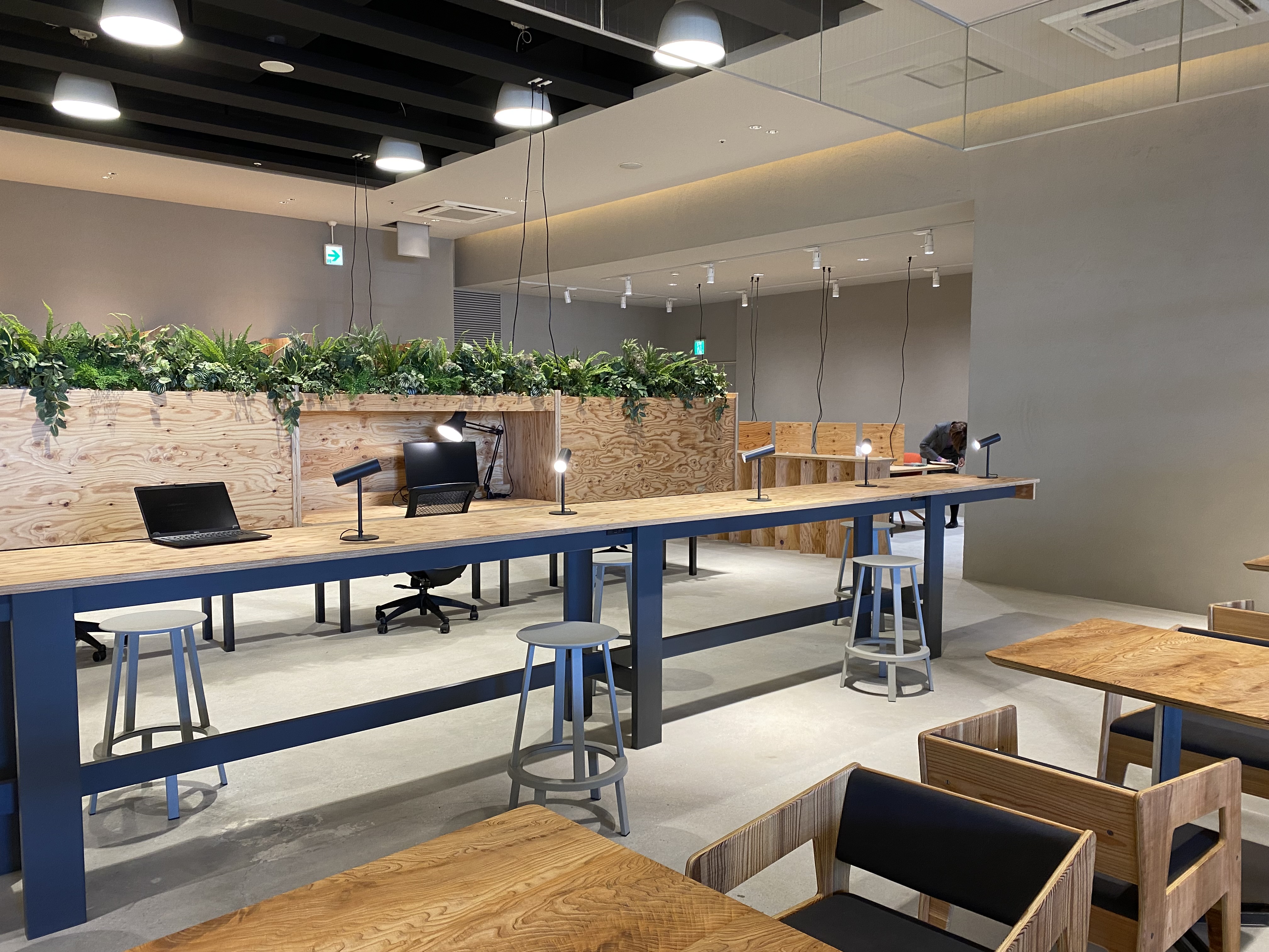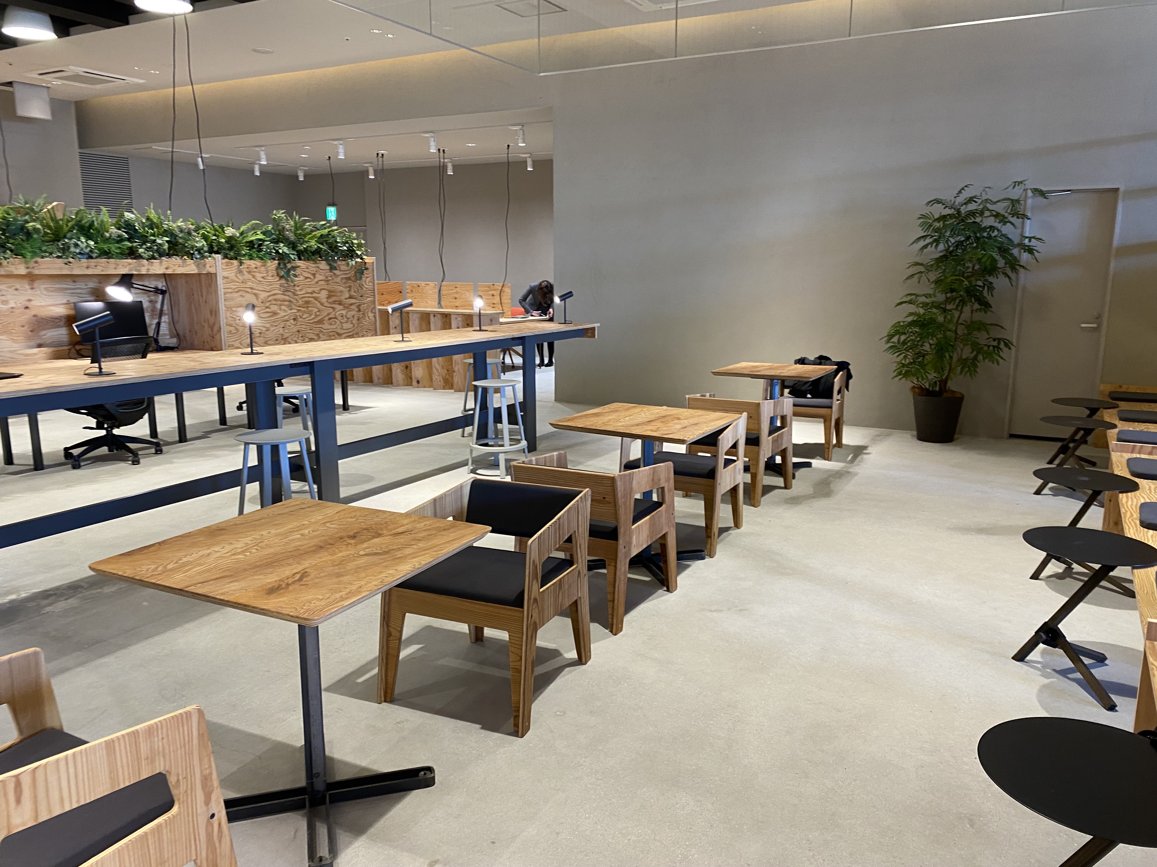 コワーキングスペースでは、Suicaなどの交通系ICカードを初会訪問時に登録する事で会費の支払や非接触での開錠などに対応。ワークスペースには、ソファ席、ハイチェア席、テーブル席、ソロワーク席やオンライン会議に対応する半個室席など全42席を用意。会議用に利用できるテーブル席も用意している。