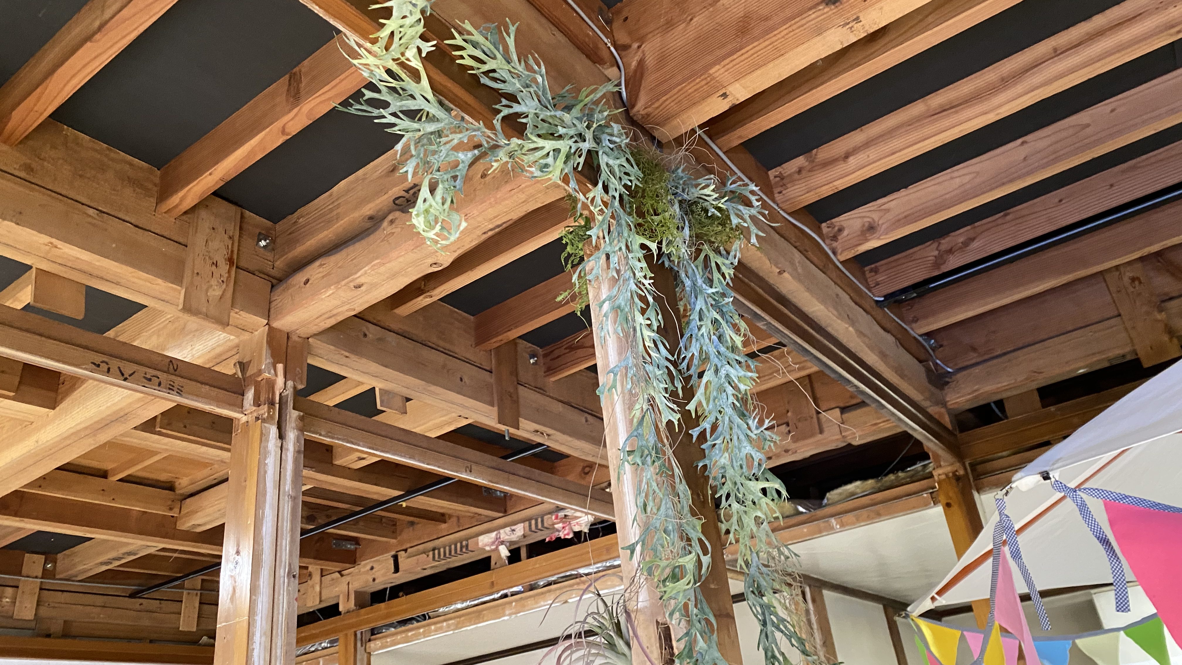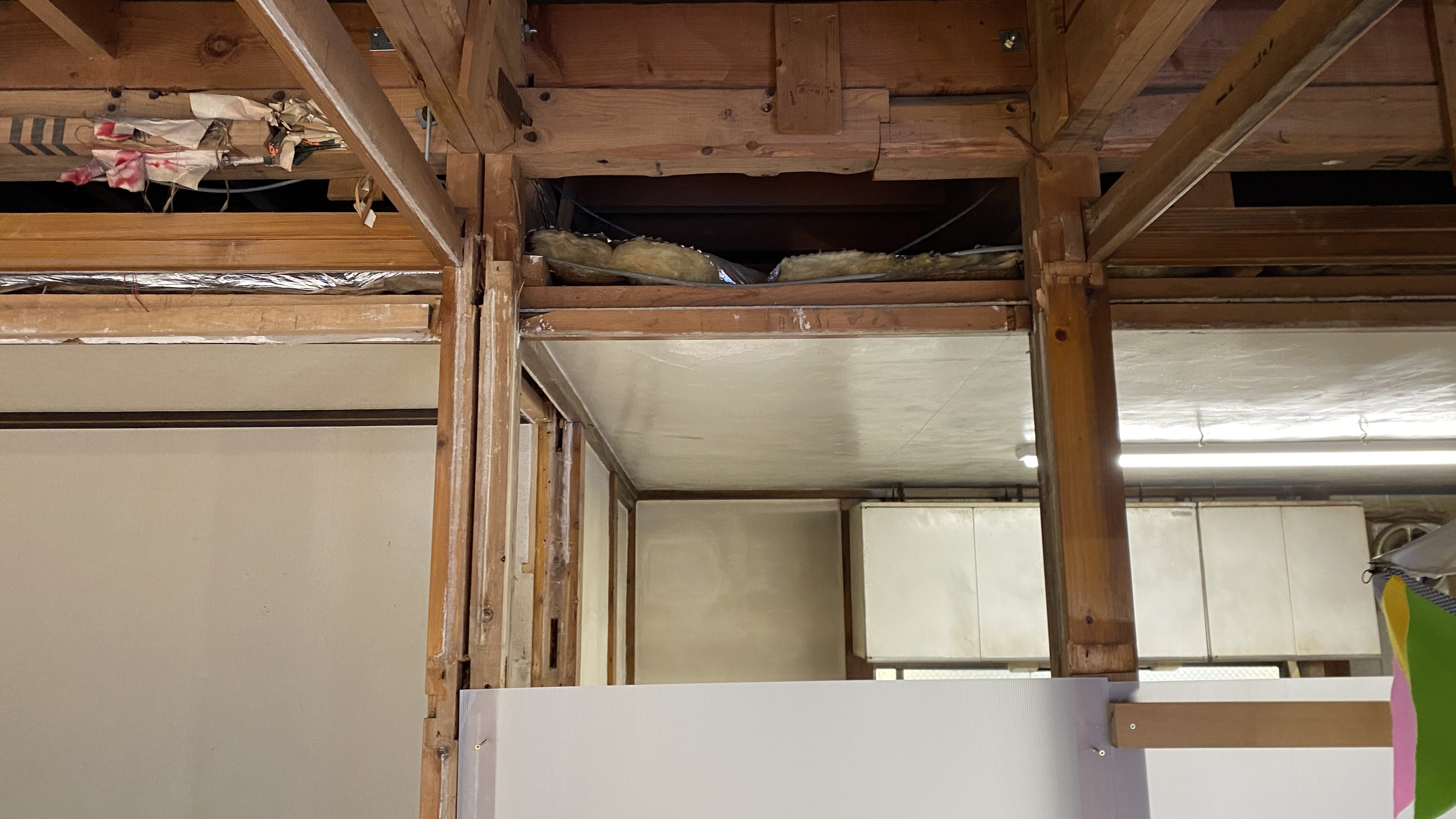 空き家は、まだ全てのリノベを完了しておらず、今回のお披露目会は実施。梁は見えているし、壁や天井の断熱材などもむき出しのまま。この状態から「この状態でも活用可能ということを示す」「空き家を直していく過程を体験プログラムにする」などの様々な意図があるそうだ。