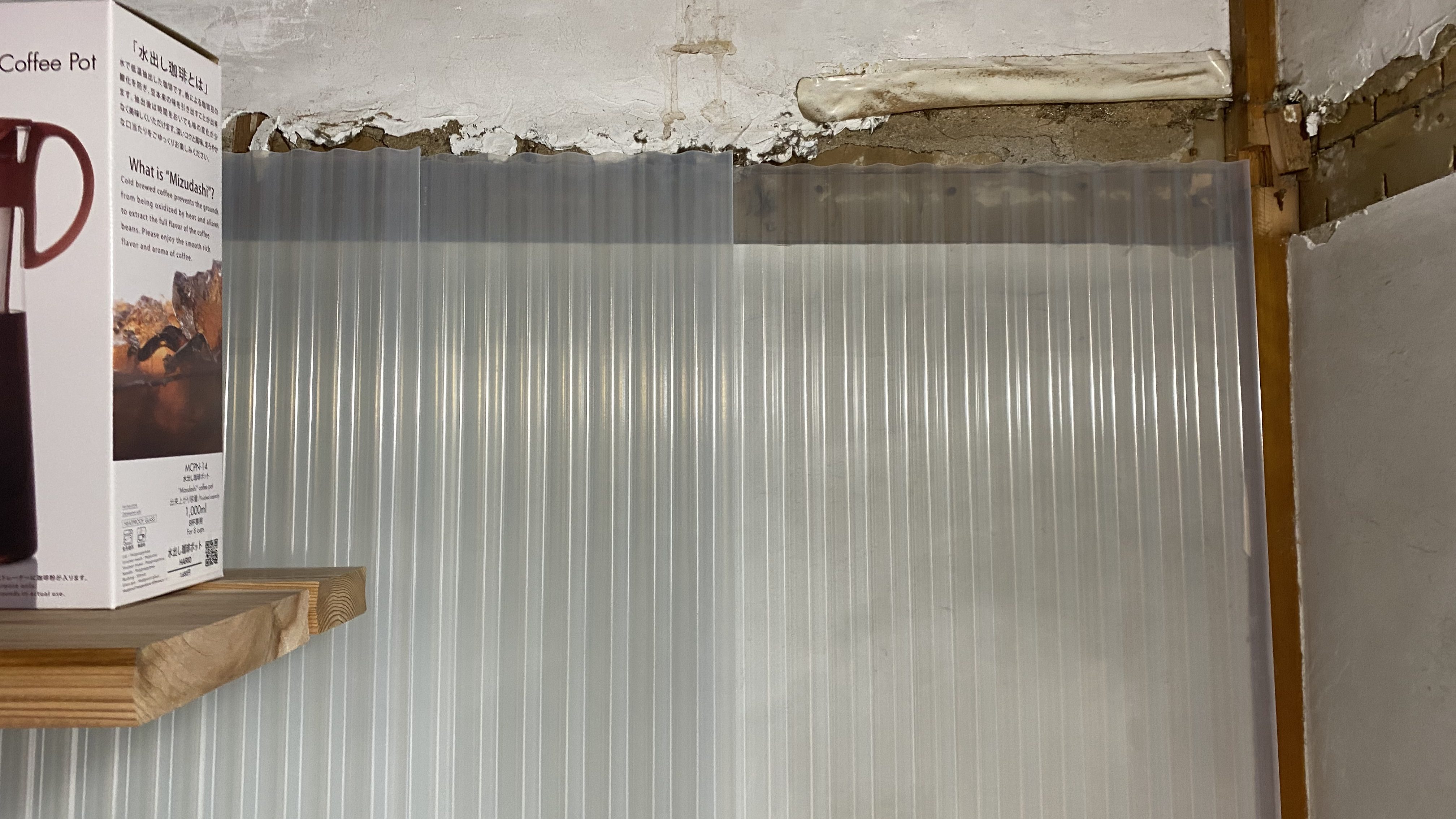 1階部分、床だけ無垢の木材を使ってリノベ―ション済み。壁はポリカボードで目隠し程度に覆っているだけという簡素な壁のあしらい。