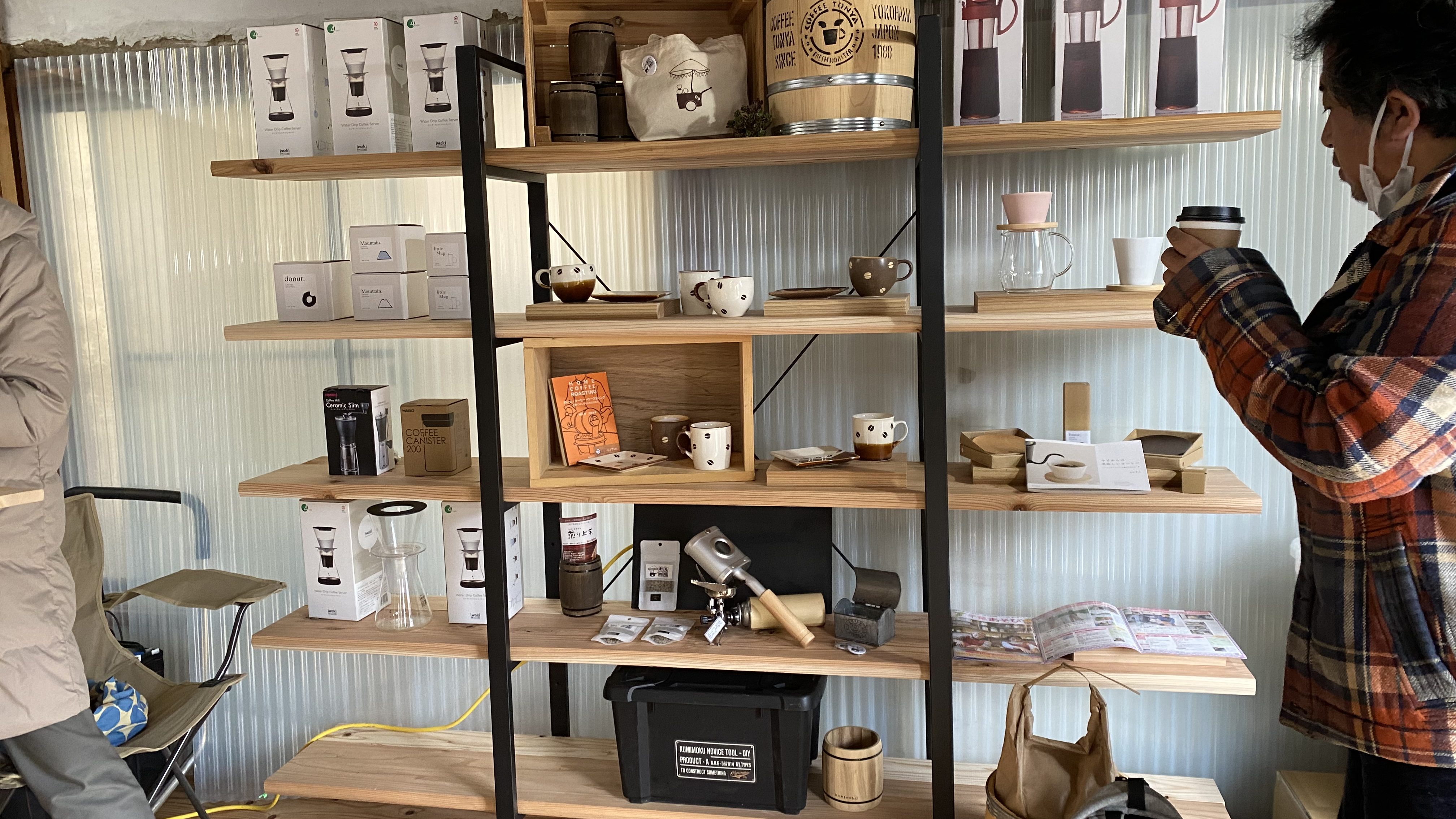 商品棚を設置して、リヤカーゴ(尾道市のマルシェで活躍している街づくり屋台)を配置するだけでこの空間がなんとなくオシャレそうに見えて、コーヒーがある事で人が集う場になるのが不思議だ。