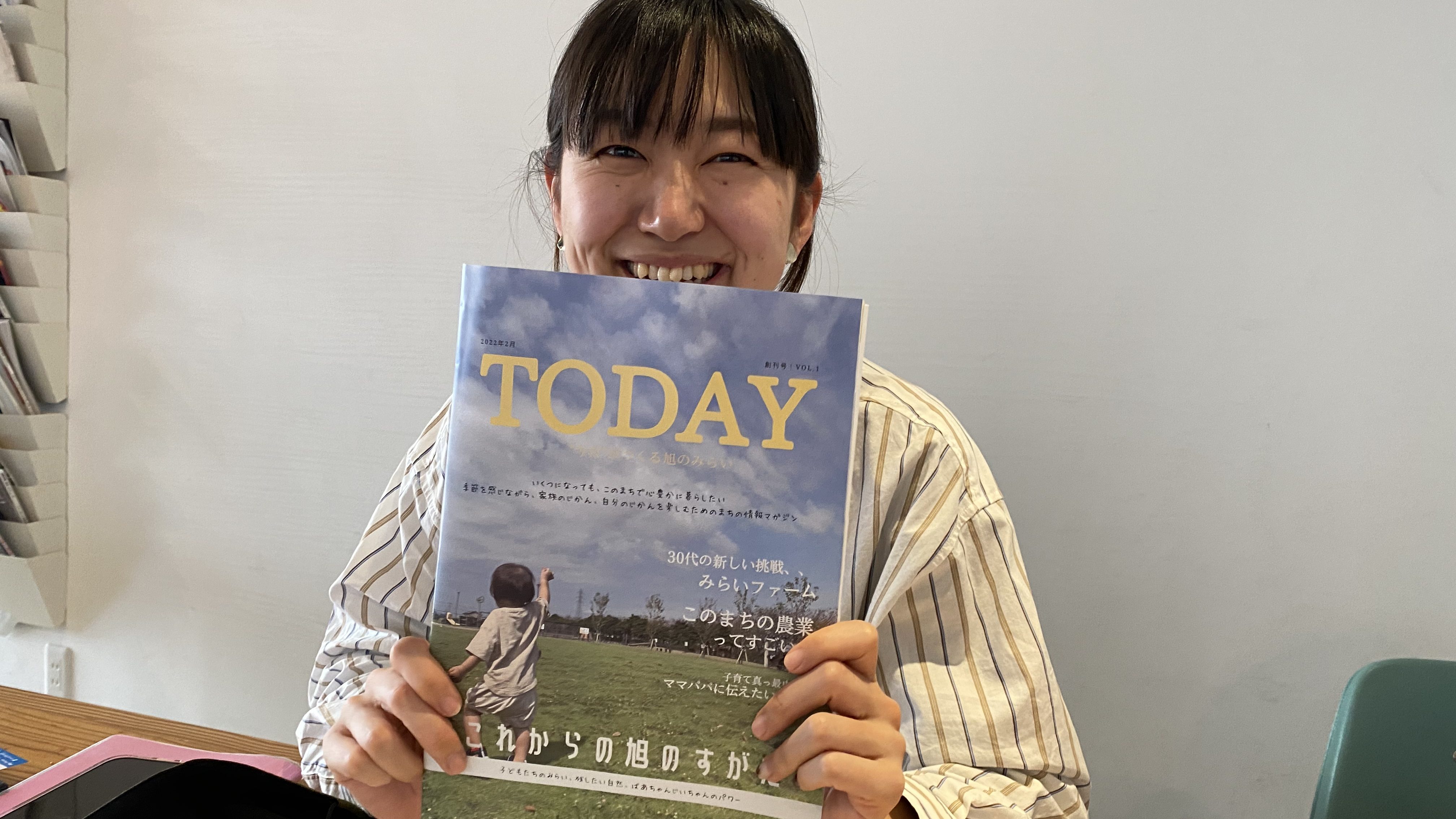 三川さんは、旭市出身。2人目の子どもを授かり、産休に入ったタイミングで「子ども達の為にできる事は何か」と考え、自分が大好きな旭市の今を残すとともに、将来の事を考えていくきっかけになる雑誌を作りたいと「TODAY」創刊を決意したという。