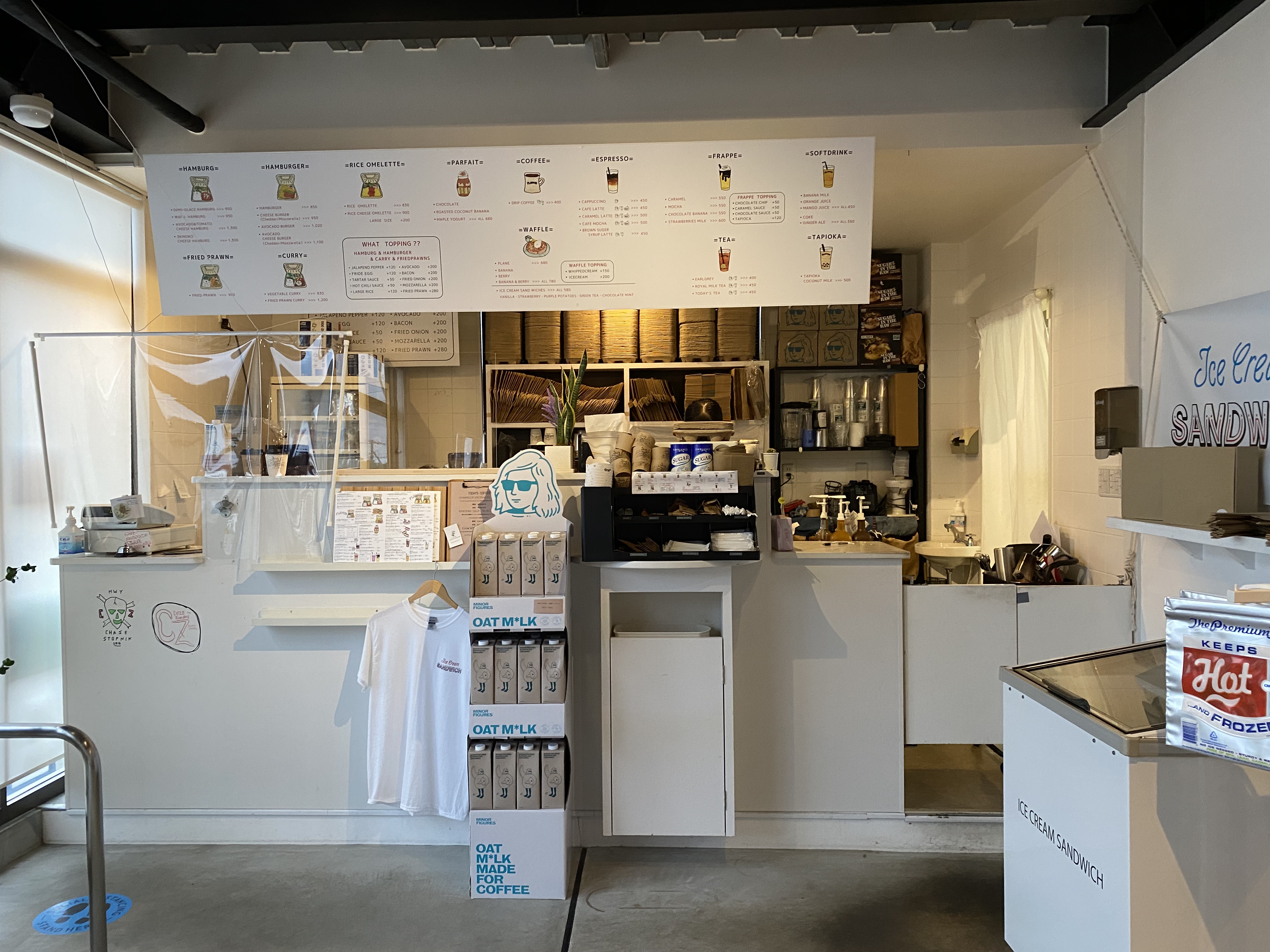 メニューもドリンクメニューからフードメニューまで充実のラインナップ。コーヒーもドリップコーヒー(400円)だけでなくエスプレッソをベースにしたカプチーノ(450円)、カフェラテ(450円)、カフェモカ(500円)、キャラメルラテ(500円)などを用意。フラッペやパフェもラインナップされている。