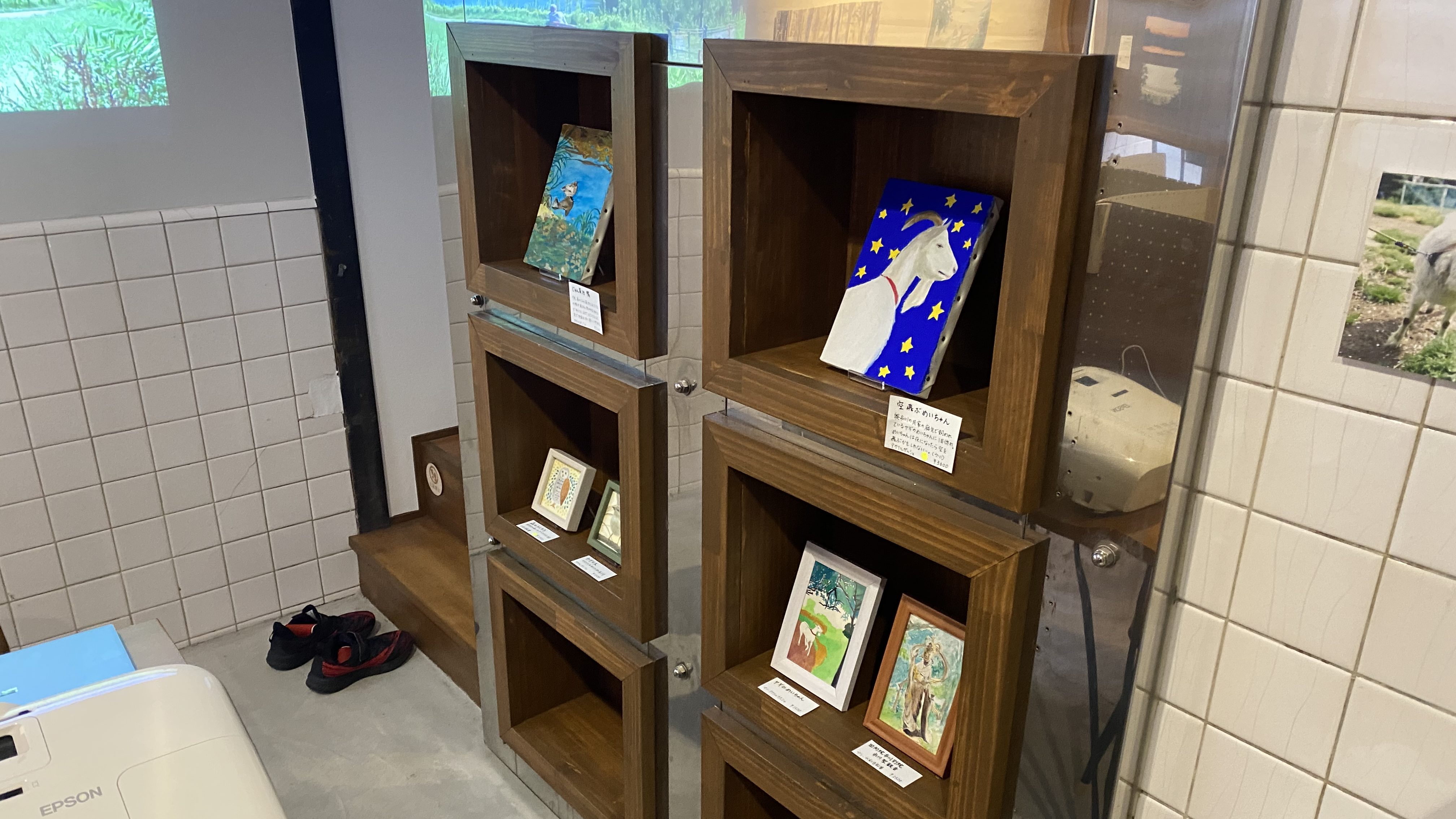 展示スペースは、以前の肉屋時代に厨房だったと思われる「土間」やタイルの壁をそのまま活かしている。金庫のような扉をもった業務用冷凍庫の内部は物置として活用し、壁の各所にはアーティストシェアハウスらしく飾り棚を設置した。