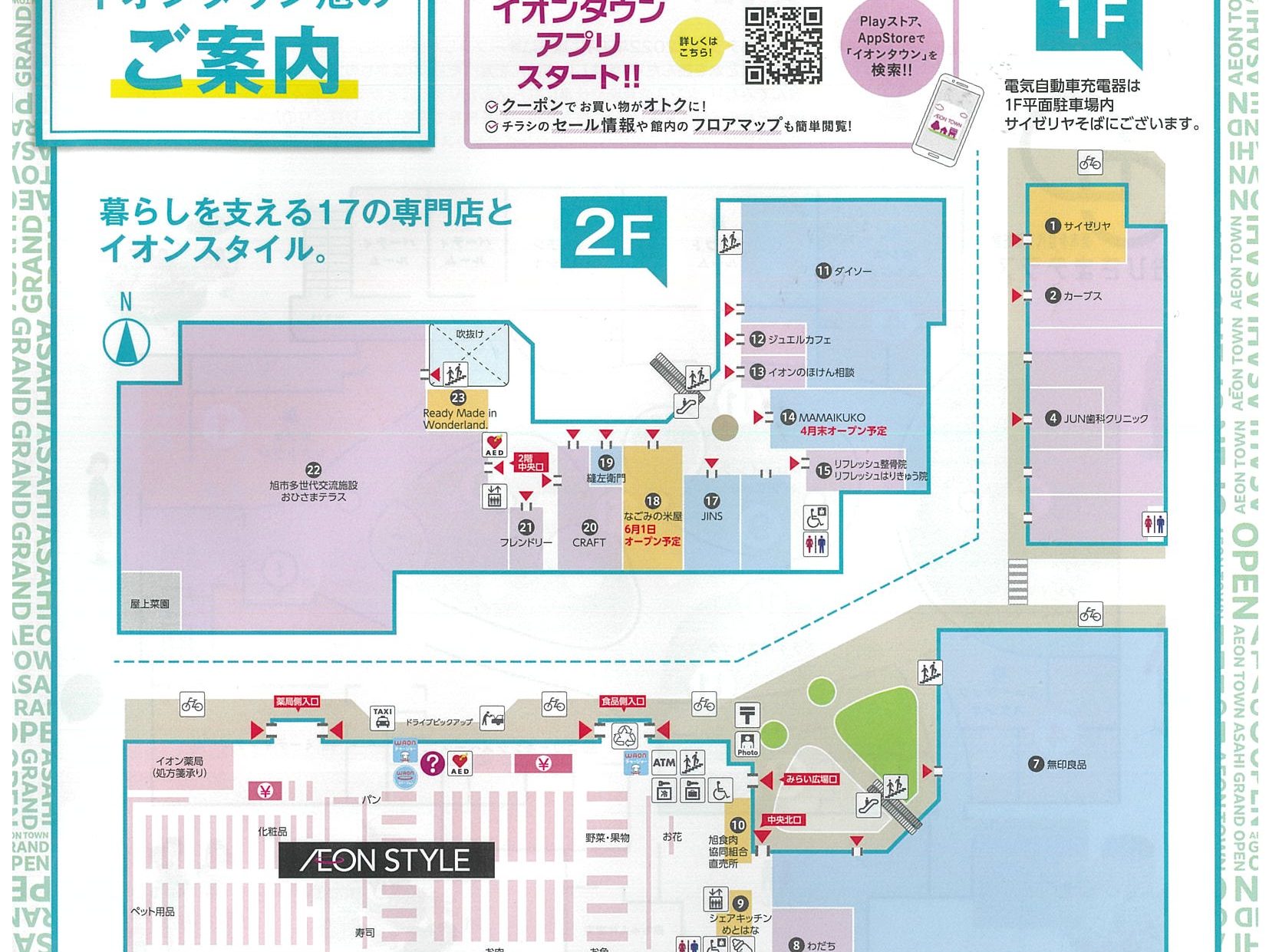 イオンタウン旭は、スーパーマーケットの「イオンスタイル」、生活雑貨全般「無印良品」「ダイソー」などの大型テナントにファミリーレストラン「サイゼリヤ」、フィットネスジム「カーブス」、メガネ専門店「JINS」などのチェーン店に加え、歯科クリニック、理・美容室、鍼灸・整骨院、保険窓口など生活に密着した17テナント(2022年6月1日時点の予定)が入居する商業施設。