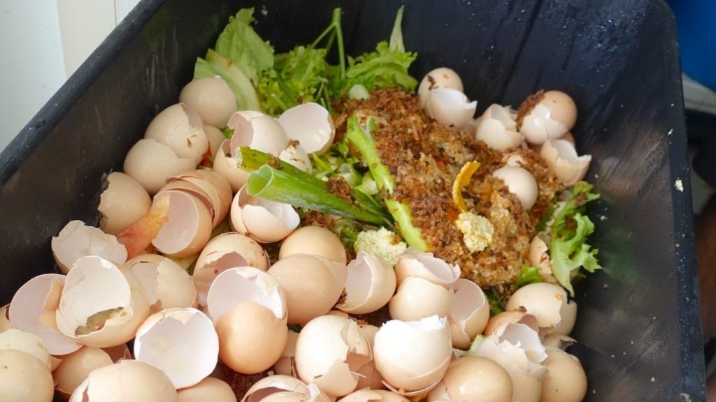 弁当や総菜から生じる野菜くずだけでなく、スイーツ作りで生じる卵も合わせて毎日の生ごみは大変な量になります。同社ではまず3店舗分の生ごみを回収し、自社で運営する畑の堆肥に変えていく取組を行っています。