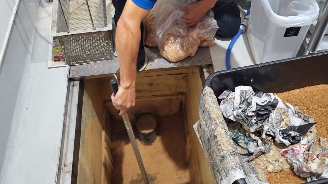 グリストラップの底に排水口があるという特性を活かし、レンコンなどの納品で「どこのスーパーにもある」という「おがくず」を使って掃除。