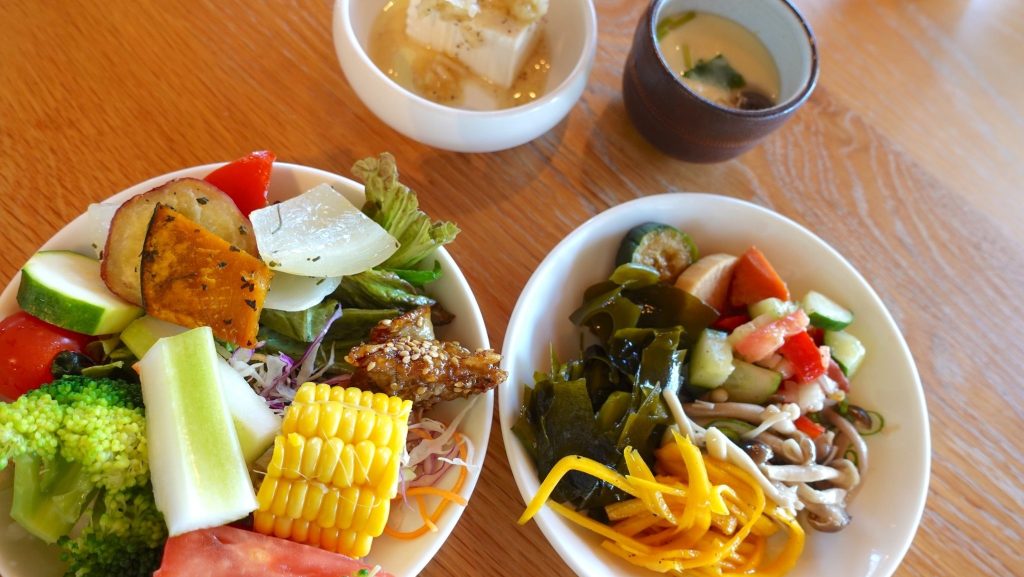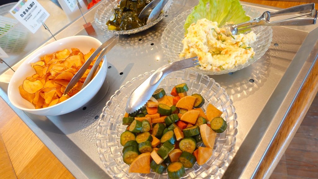 基本のセットを注文すると約20種類の惣菜ビュッフェを自由に食べられるようになる。それらの全てがどこか懐かしい感じの家庭の味で「お母さんが子ども達や家族の健康を考えて丁寧に作っている料理」という味付け。しっかり出汁をひいているので余計な調味料を使っていないのであろうことは一口食べでわかる。