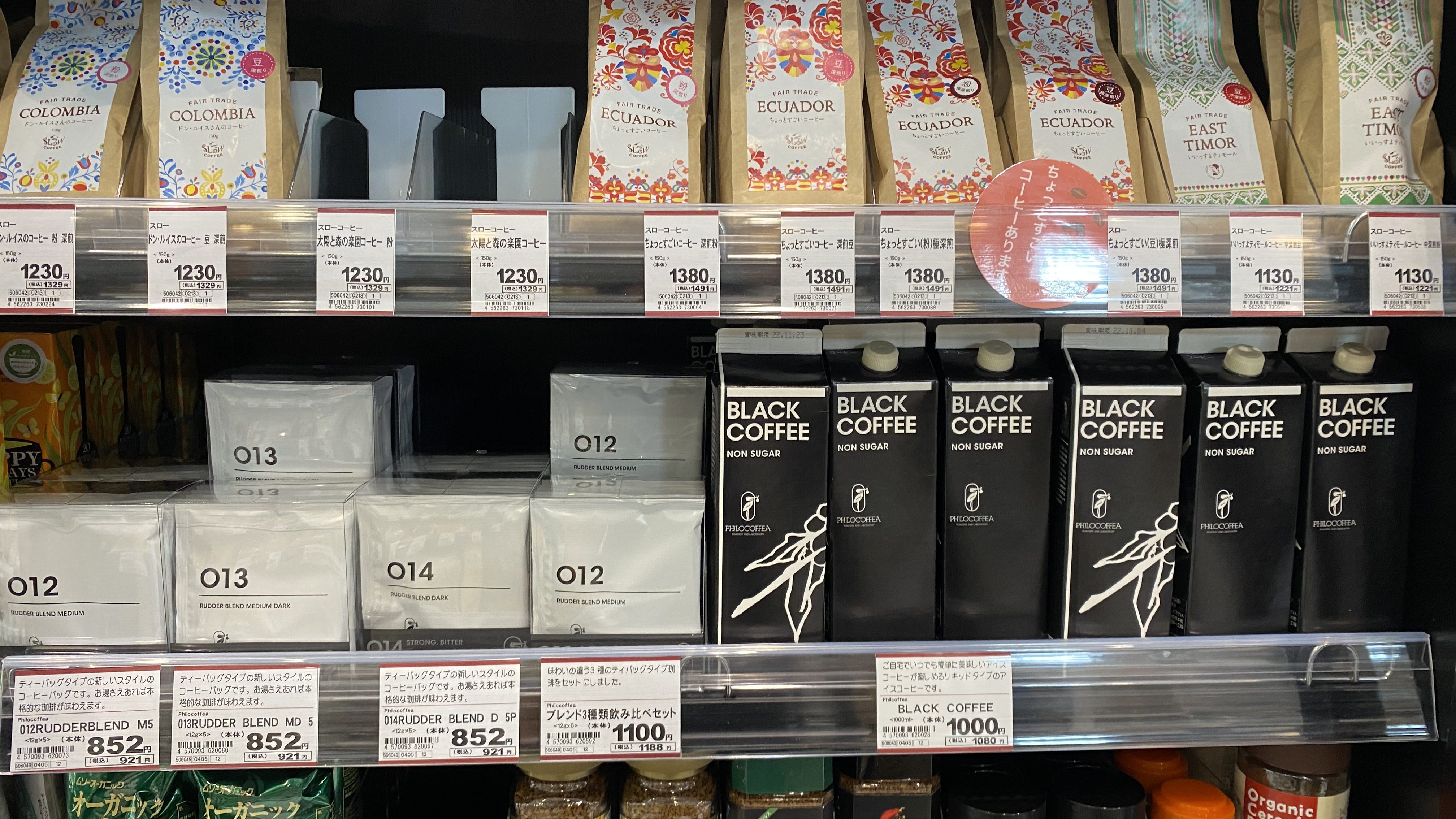 ビオ・あつみエピスリーの棚に陳列されている商品は、基本的に身体を気遣う人たちにうれしいオーガニックや有機栽培、フェアトレードなどの高価格帯のハイブランド。もちろん、コーヒータウン船橋市を代表する「フィロコフィア」の商品も並びます。